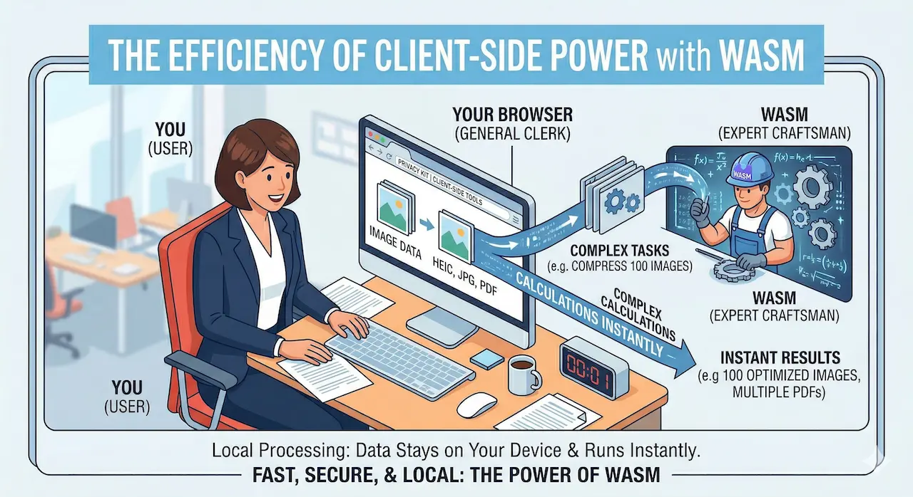 This article explains WebAssembly (WASM) — the technology that makes it possible to run heavy processing directly in your browser, with no server involved. By the end, you will understand how modern browser-based tools can be both faster and fundamentally more private than their cloud counterparts.